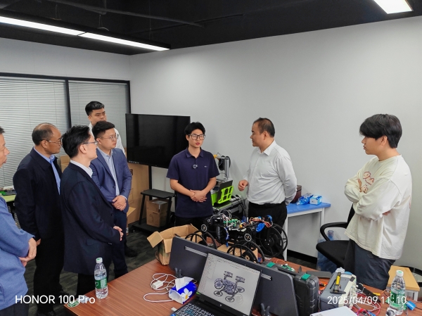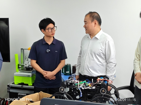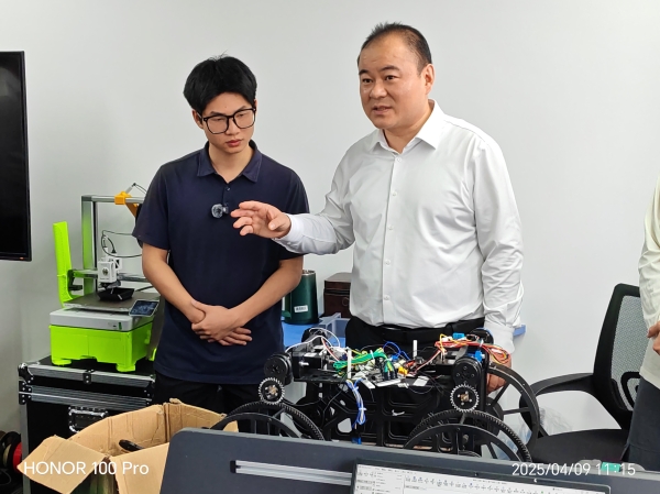 调研期间,朱健重点考察了团队科技创新成果。在认真听取"灵巧蛇影辅助救援勘测智慧机"和"三栖救援巡检机器人"两款创新作品的专题汇报后,朱健对作品的创新性和实用性给予高度评价,充分肯定了beat365学子在科技创新方面展现出的专业素养和创造才能。朱健指出,beat365手机版官方网站学生展现出新时代青年特有的创新活力和实践能力。他勉励同学们要持续保持创新热情,将创新创业项目作为长期事业来发展,把专业知识转化为实际应用,为社会进步贡献智慧力量。