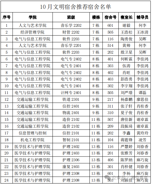 为营造整洁、舒适、文明的宿舍环境,培养学生良好的生活习惯与团队协作精神,校宿舍管理委员会严格依照宿舍 6S 管理标准,开展了文明宿舍评选活动。经个人自主申报、栋位栋长与层长推荐、宿舍管理委员会初评、学生工作处审核,最终评选出了 10 月份校级文明宿舍。现将评选结果予以公布,具体名单如下: