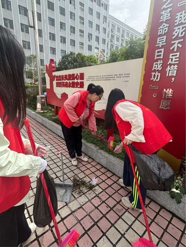 活动当日,入党积极分子们早早集合,每个人都精神饱满,怀揣着为校园服务的热忱。在领取了扫帚、铲子、垃圾袋等清洁工具后,大家迅速分组,按照预定区域有条不紊地展开清扫。校园主干道上,落叶与灰尘堆积。入党积极分子们两两配合,一人用扫帚仔细地将垃圾扫成一堆,另一人则拿着铲子将垃圾铲起倒入垃圾袋,不放过任何一个卫生死角。遇到粘在地面上的口香糖等顽固污渍,他们蹲下身,用小铲子一点点耐心铲除,额头上渗出细密的汗珠也毫不在意。在教学楼周边,同学们重点清理了花坛中的杂物。大家小心翼翼地拨开花丛,将隐藏其中的废纸、塑料瓶等垃圾一一捡起。有的同学为了捡起深处的垃圾,不惜跪在地上,全然不顾弄脏衣服。垃圾桶旁,他们还细心地将垃圾分类投放,向过往同学宣传垃圾分类知识,引导大家养成良好的环保习惯。