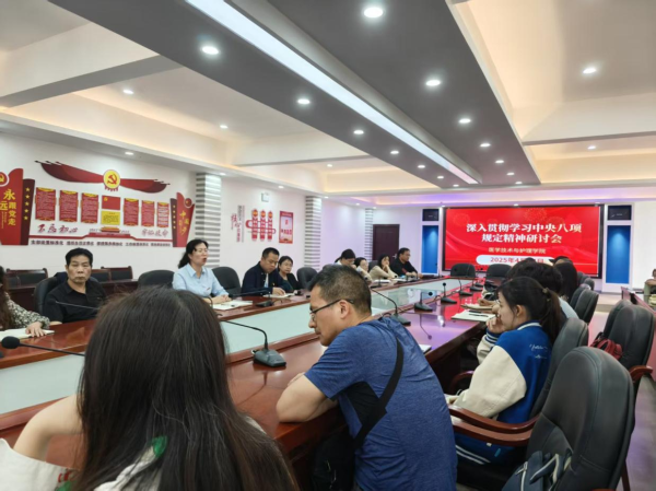 (医学技术与护理学院 通讯员:邓丽)为深入学习贯彻中央八项规定精神,进一步加强作风建设,4月17日下午,医学技术与护理学院在医护实训楼二楼会议室组织召开专题研讨会。学院党政领导班子成员、全体党员干部、教师代表参加会议。