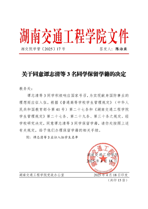 关于同意谭志清等3名同学保留学籍的决定(湘交院学管〔2025〕17号)