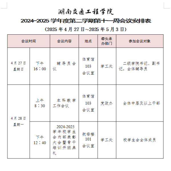 beat365手机版官方网站2024-2025学年度第二学期第十一周会议安排表