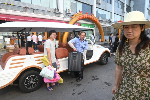 ▲ 保卫处工作人员用观光车为新生送行李