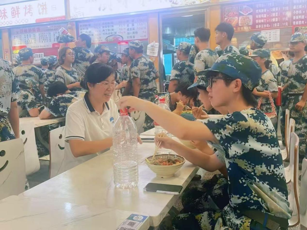 邓丽书记与刘建军副书记亲切地坐在同学们中间,一边用餐一边关切询问大家的军训感受和生活情况。“训练强度能适应吗?”“食堂饭菜还合口味吗?”“晚上休息得怎么样?”一句句暖心问候,让新生们真切感受到学院的温暖。同学们也纷纷打开话匣子,分享军训趣事和初入大学的体验。