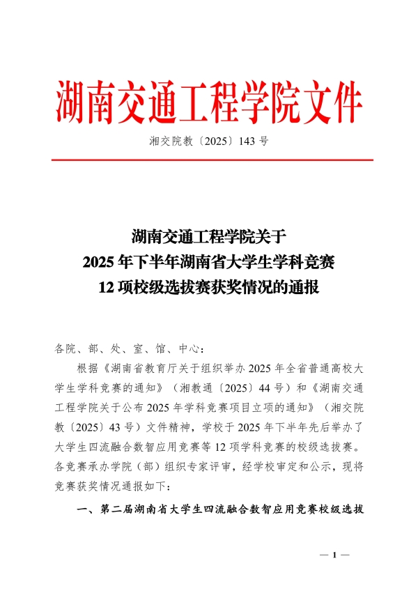 关于2025年下半年湖南省大学生学科竞赛12项校级选拔赛获奖情况的通报