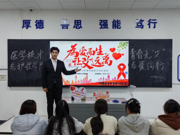 为进一步提高青年学生的防艾抗艾意识,筑牢校园健康防线,12月11日中午,医学技术与护理学院于教学楼201教室举办“青春无“艾”,与爱同行”主题宣传活动。