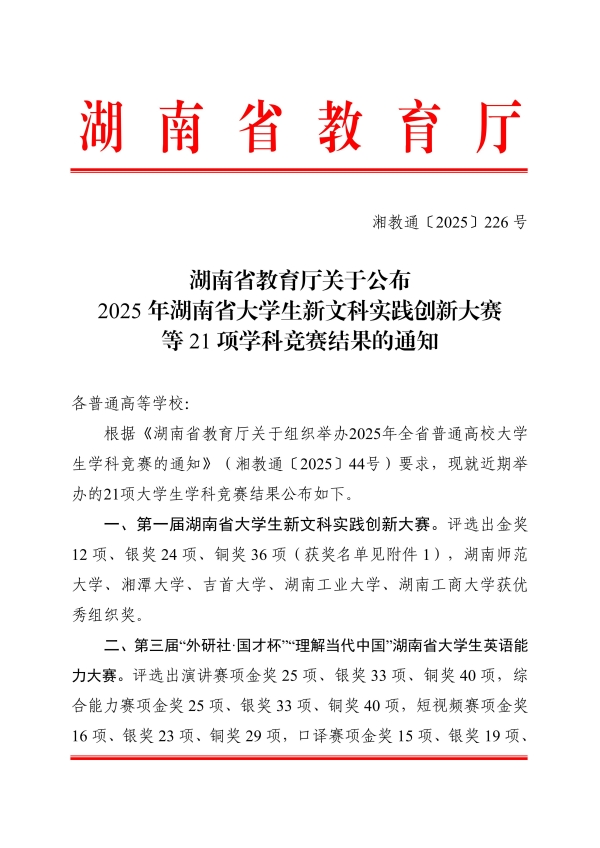 转发:湖南省教育厅关于公布2025年湖南省大学生新文科实践创新大赛等21项学科竞赛结果的通知