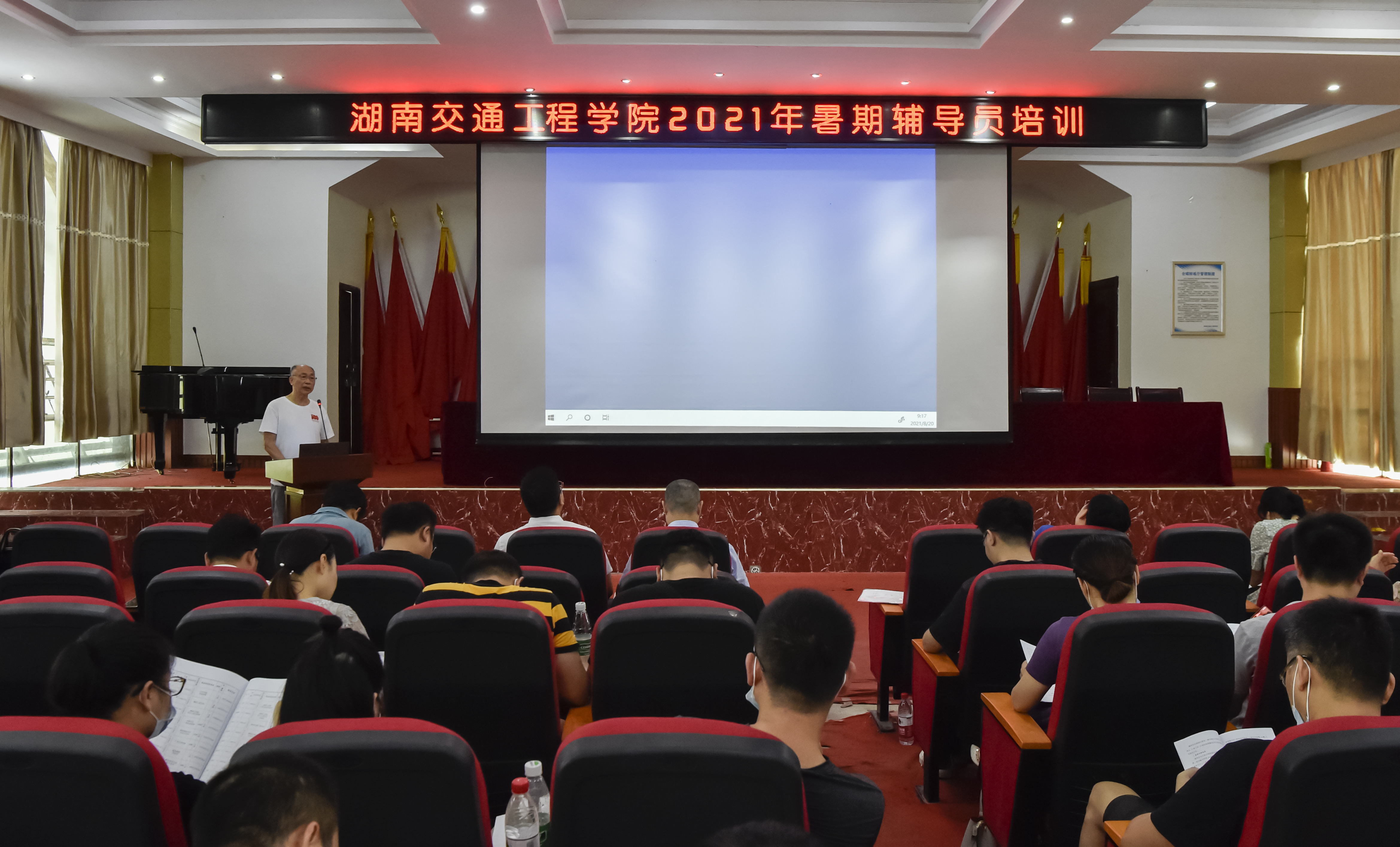 本网讯(记者 赵红深 摄影 李建华)为贯彻《关于加强和改进新形势下高校思想政治工作的意见》《普通高等学校辅导员队伍建设规定》等文件精神,全面提升辅导员队伍的政治素质、理论水平、专业素养和职业能力,8月20日上午,学校2021年暑期辅导员培训班开班仪式在航母楼101多功能厅举行。党委副书记李先聪,副校长余孟辉,学生工作部副部长刘海滨参加了培训的计划、组织和指导工作。学生工作部成员,各二级学院党总支书记、副书记和全体专兼职辅导员、新进辅导员共70余人参加了培训,仪式由余孟辉主持。