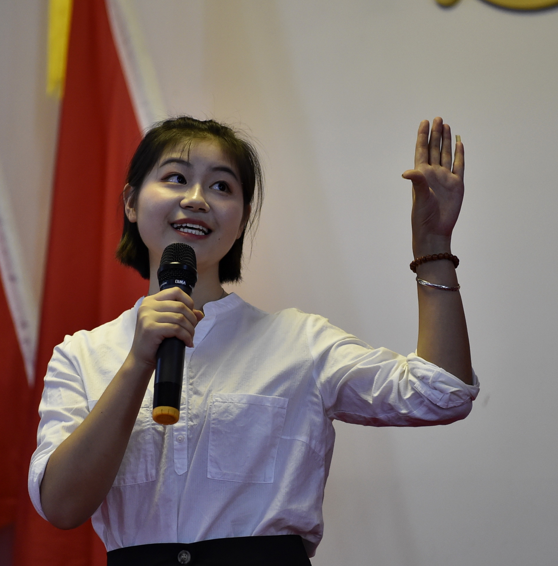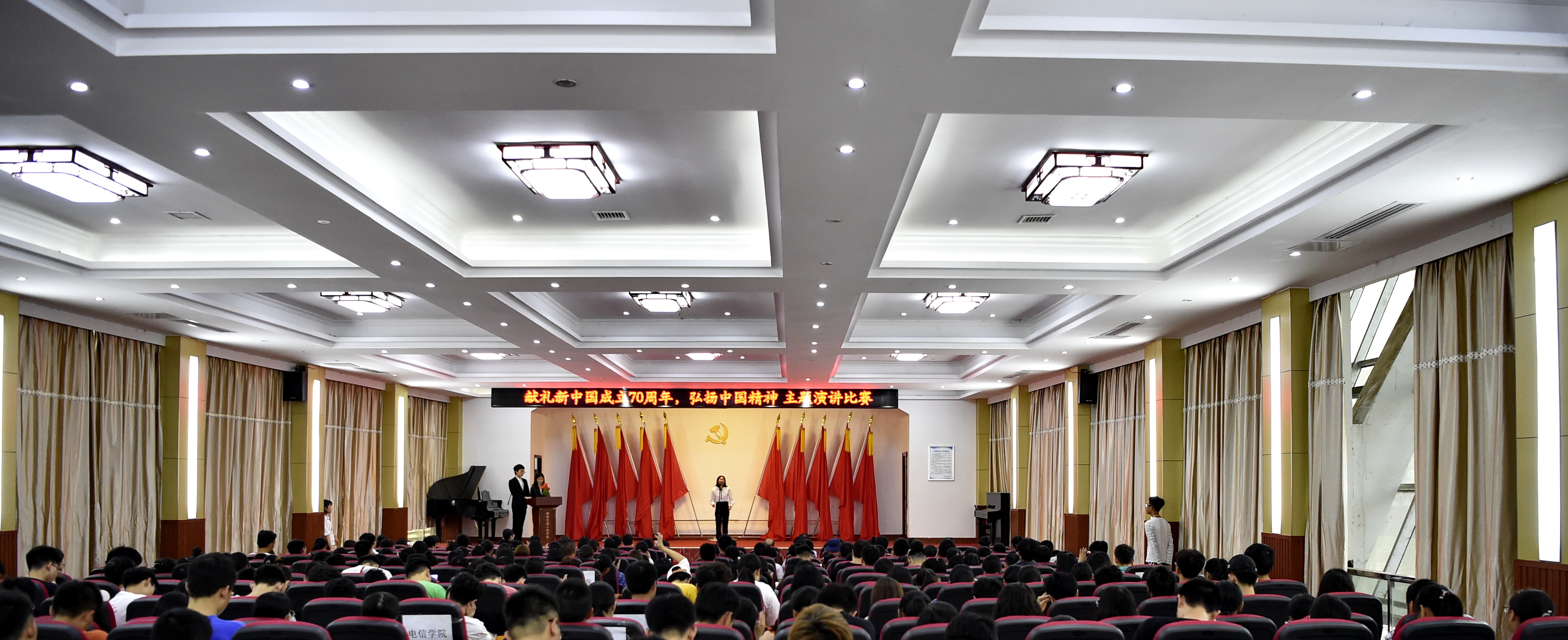 本网讯(通讯员摄影李建华)9月29日下午,“献礼新中国成立70周年,弘扬中国精神”主题演讲比赛决赛在学校航母楼会议大厅举行。来自各二级学院的11名选手参加了决赛,在演讲的过程中,同学们结合自身的经历和感受,或讲述中国从历经磨难到现在无比繁荣的华丽巨变,或歌颂祖国70年来取得的辉煌成就,或表达对祖国的无限热爱和身为中国人的无比自豪,或表示要为祖国的强大而努力奋斗……选手们声情并茂的演讲,发自肺腑的情感流露赢得了现场评委和观众热烈的掌声。