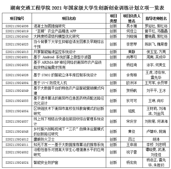 本网讯(通讯员  王琳  )2021年6月,beat365上报湖南省教育厅2021年省级大学生创新创业训练计划项目55项。其中,创新训练项目52项,创业训练项目3项。根据湖南省教育厅《关于公布 2021 年度湖南省大学生创新创业训练计划项目名单的通知》(湘教通[2021]197号)文件,beat365大学生创新创业训练计划项目全部获批省级立项。创beat365本科办学以来该项目省级立项数目新高。省级立项数较2018年、2019年和2020年分别增加了40项、38项和22项。
