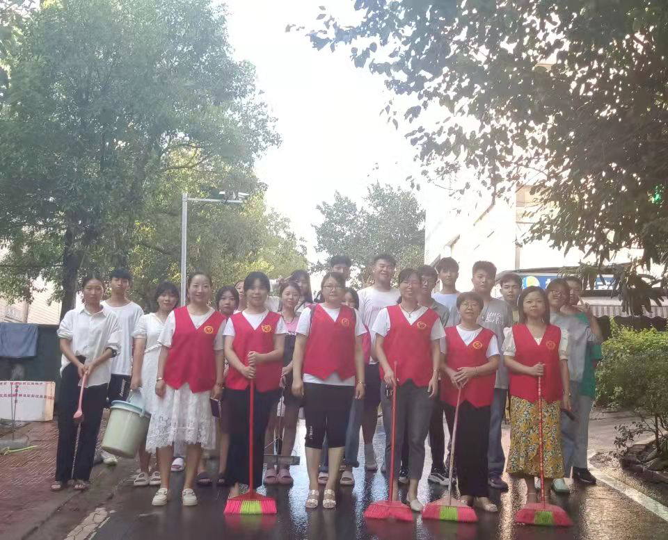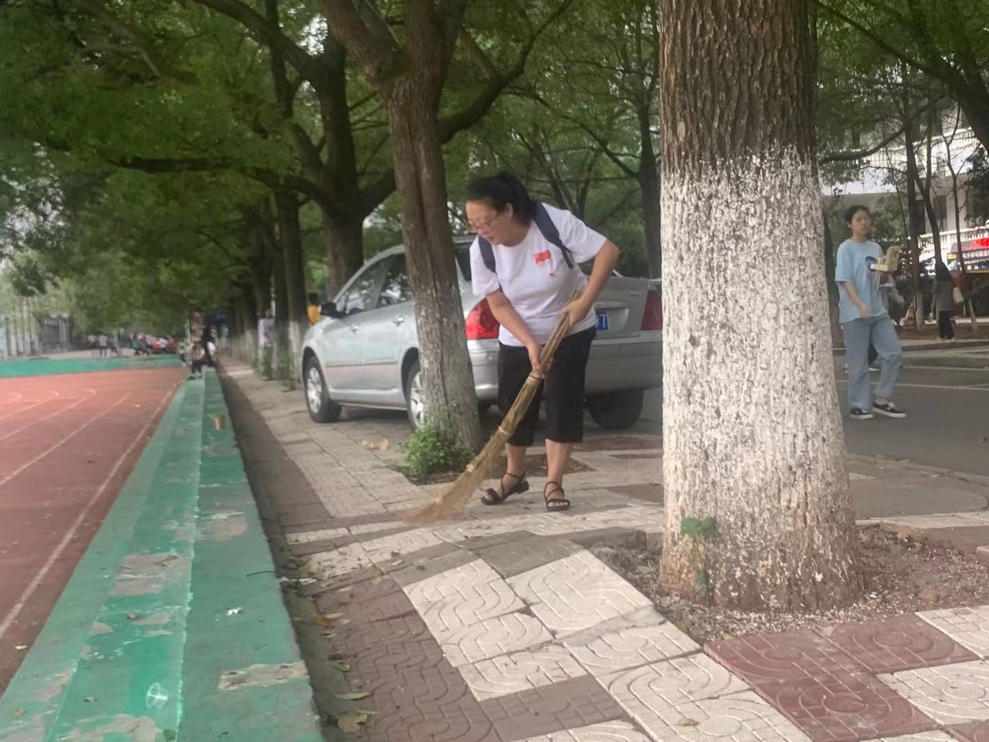 (图为人文与艺术学院沈飚书记和辛敬凤副书记带领辅导员组织学生打扫公共区卫生)