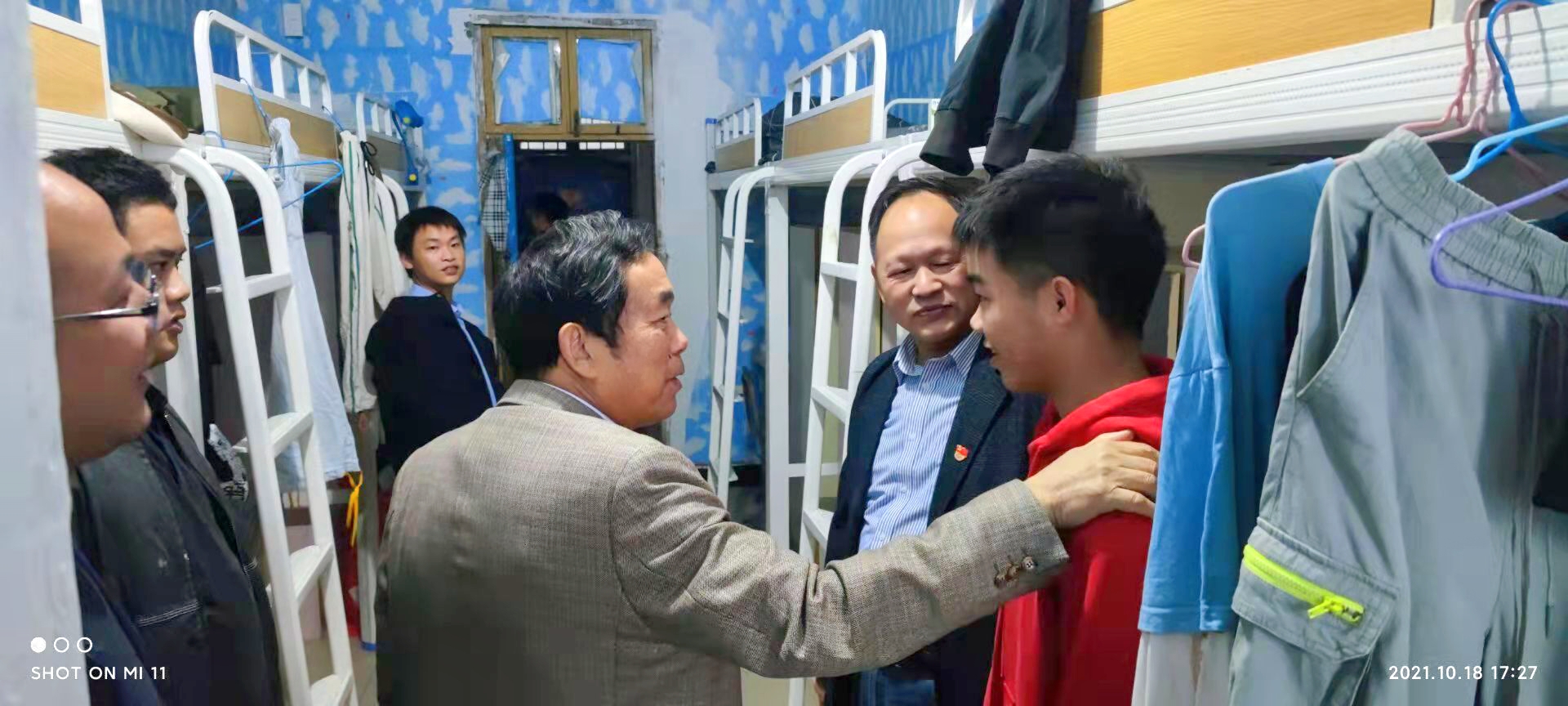 刘福生逐栋逐层地探视宿舍环境,走访学生,同时还非常重视学生宿舍消防安全。在视察完9号栋学生宿舍,董事长又来到15号栋检查宿舍消防安全,对学生宿舍的构造,宿舍设施设备,董事长如数家珍。获悉董事长走访学生宿舍,越来越多的辅导员赶到现场。刘福生董事长对大部分辅导员都相对熟悉,与辅导员亲切交流,告知辅导员,学生和学生寝室的风貌反映了学院、学校的风貌,学生宿舍作为学生的重要生活场所,不仅要加强宿舍条件、卫生等硬环境的打造,更要注重和谐的氛围、上进的文化、高尚的情操等氛围的建设。同时,检查宿舍不能只落在卫生、安全等表面,更要引导学生礼仪、素养的习惯养成。