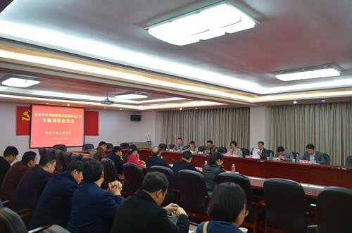 本网讯(通讯员摄影李建华)为深入贯彻落实全国高校思想政治工作会议精神和中共中央关于加强和改进新形势下高校思想政治工作的意见精神,切实做好高校党建和思想政治工作,318日上午,省委宣传部、省委统战部、省委教育工委、团省委、省社科院联合组成的全省高校党建和思想政治工作专题调研第二组一行7在省委教育工委宣传部刘书华部长的带领下,来beat365调研党建和思想政治工作。校党委书记苏玲,校党委副书记李先聪、常务副校长彭文武,副校长黄名文,刘孟祥博士,党委委员、党务工作部副部长邓丽出席调研座谈会,相关职能部门负责人,二级学院党总支书记和副书记代表,思政课教师、心理健康教育教师和辅导员代表,教工和校团委学生会代表参加调研座谈会。李先聪主持会议。
