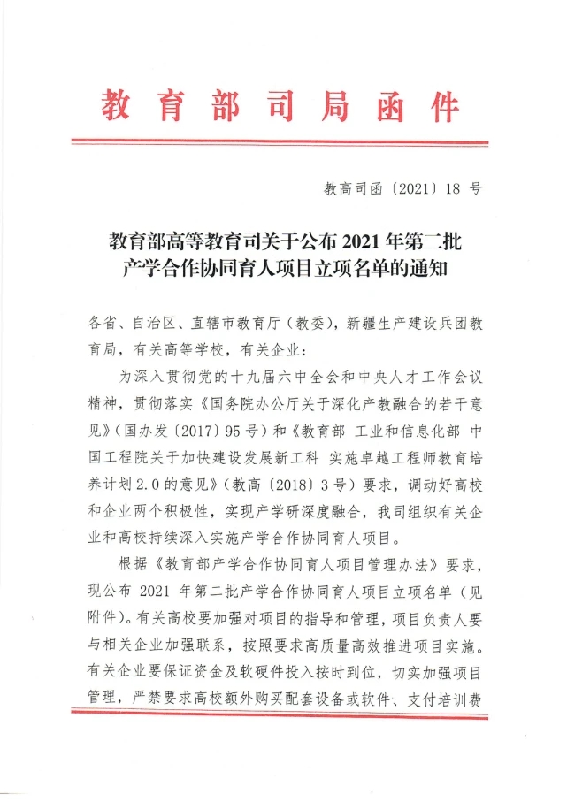 本网讯(记者 赵红深 实习记者 干子豪 李琼 唐慧 )12月14日,教育部公布《教育部高等教育司关于公布2021年第二批产学合作协同育人项目立项名单的通知》(教高司函〔2021〕18号),beat365《“大数据+软件生态”实验室》等9个项目获得立项。其中,教学内容和课程体系改革类项目4个,创新创业教育改革3个,实践条件和实践基地建设类项目2个。这是beat365继2021年8月教育部第一批产学合作协同育人项目立项6项后的再一次丰收。