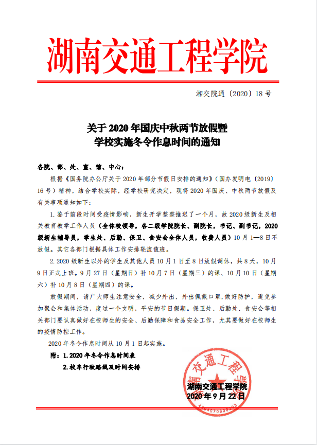 关于2020年国庆中秋两节放假暨学校实施冬令作息时间的通知