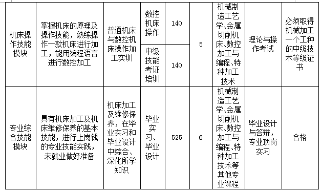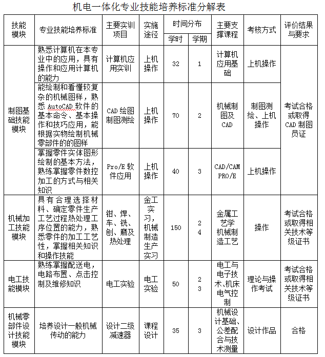 本专业培养拥护党的基本路线, 掌握机电专业必备的基础理论和专门知识,具有从事专业实际工作的综合职业能力和全面素质,适应生产、建设、管理、服务第一线需要的,具备机电一体化技术基础理论基本技能,掌握机械制造的加工工艺,能从事普通机床操作、数控机床操作与编程、机电产品设计与工艺设计、车间现场管理、机电产品销售与售后服务以及机电设备的维修、安装、操作等工作,德、智、体、美等方面全面发展的高素质、高技能人才。