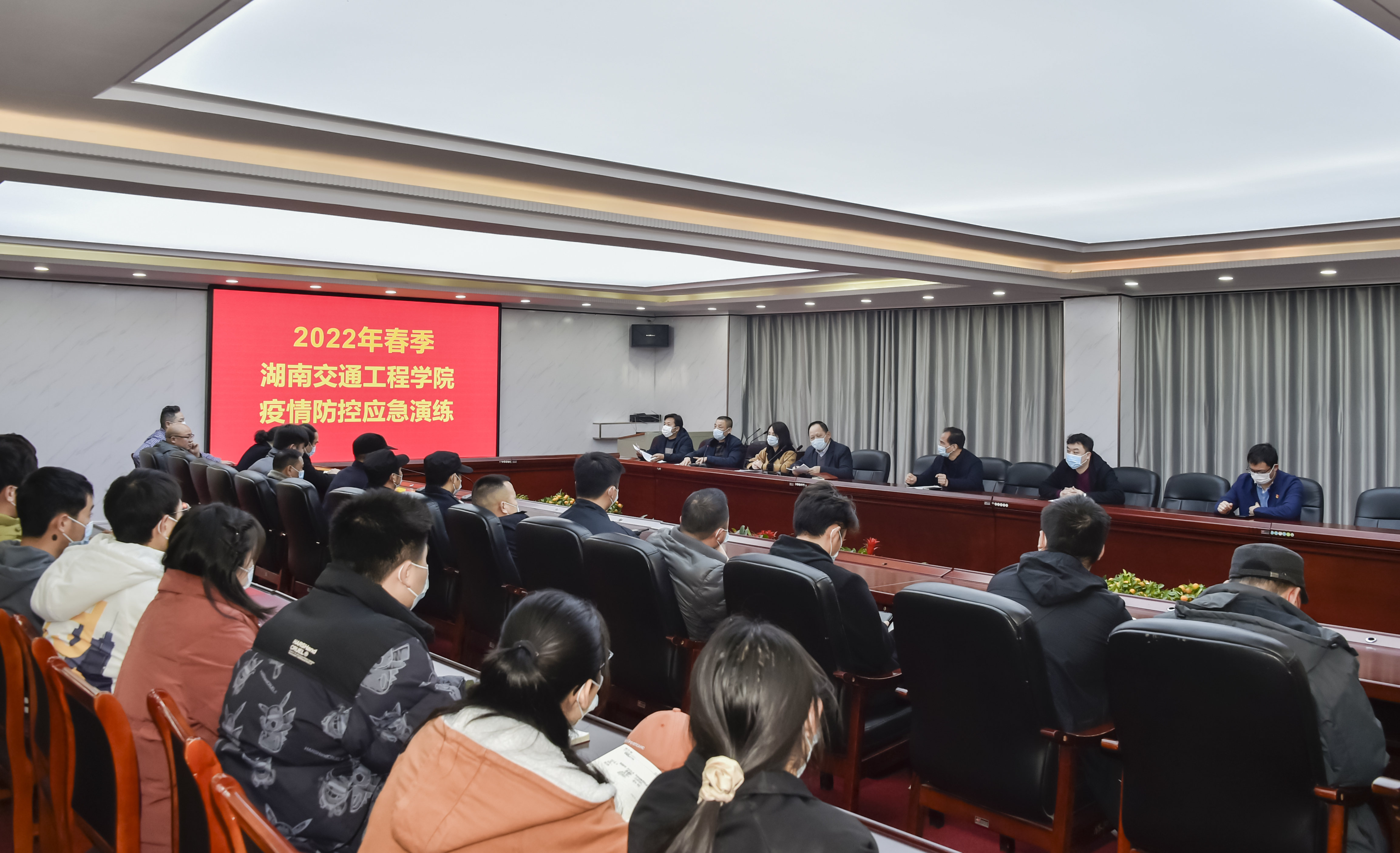 场景二15栋学生宿舍内:以一名学生晨检时发热为背景,模拟了逐级报告、启动预案诊疗、转送发热学生至南华大学附二医院发热门诊检查、学校隔离区接收学生的全过程。