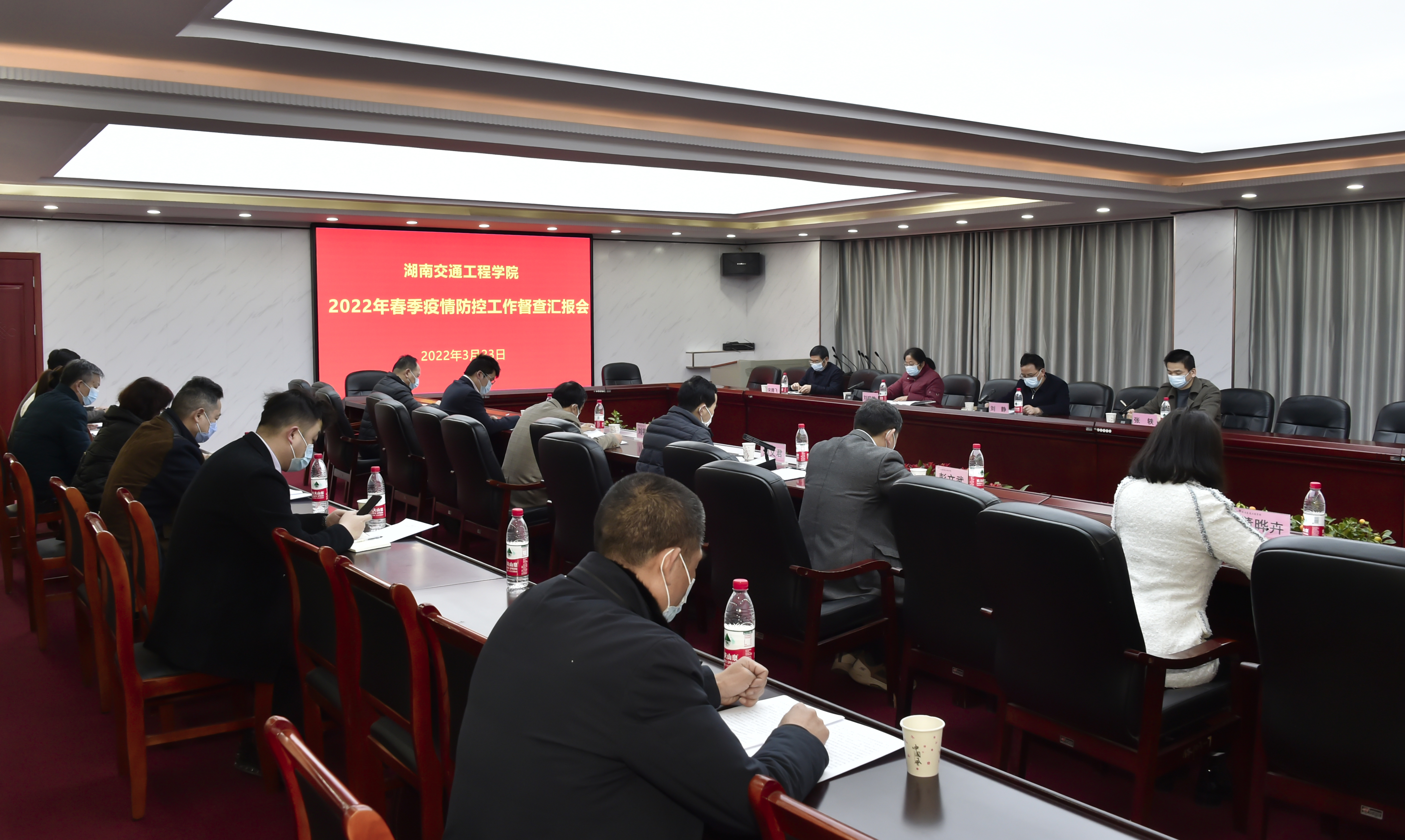 随后,学校在体育馆103会议室召开疫情防控工作督查汇报会,刘文君代表学校汇报了疫情防控工作基本情况、主体责任落实情况、防控措施落实情况、存在的薄弱环节及下一步工作计划等情况。