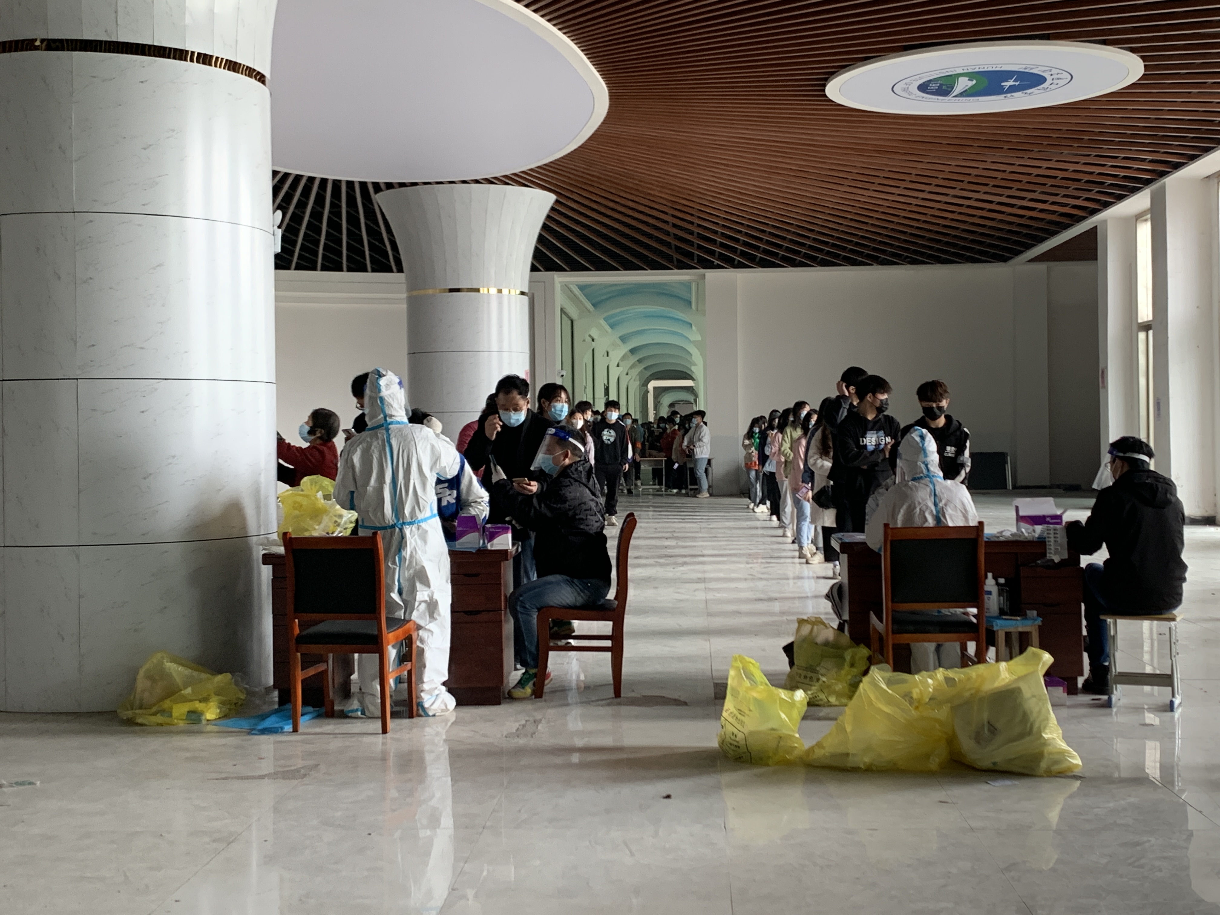 在检测现场,每个采样点均按照要求设置了测量体温区、扫码登记区、核酸检测区、缓冲区和临时隔离区等,十人一组分批次进入采集点,师生们全程佩戴口罩并保持距离,提前亮出健康码,现场扫描场所码,并按照指引依次有序离场,确保整个检测过程快速、准确、规范。