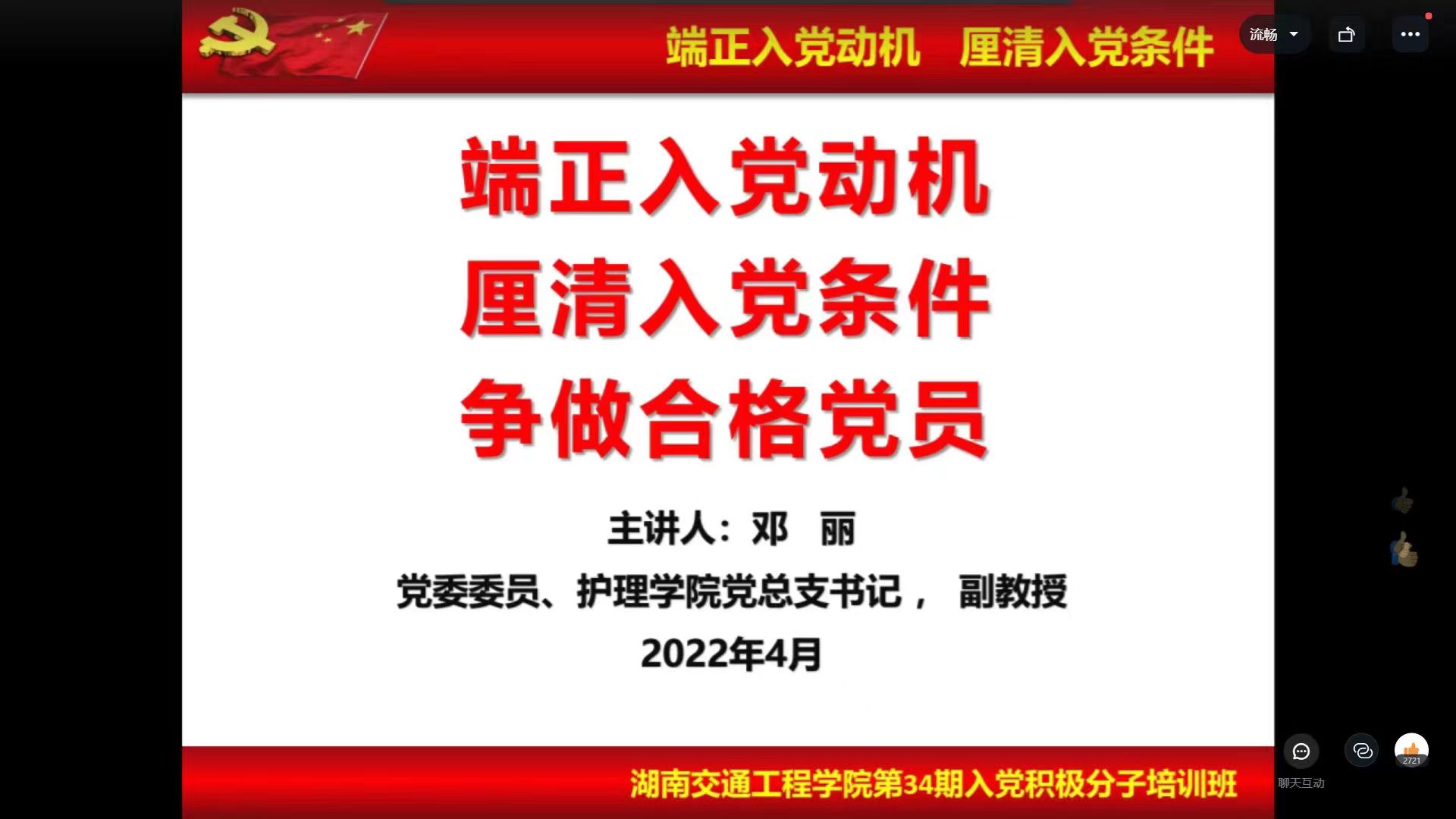 本网讯 (学生记者 向妮娜 )为深入贯彻落实习近平新时代中国特色社会主义思想,常态化长效化开展党史学习教育活动,进一步加强对入党积极分子的培养、教育和考察,提高入党积极分子的政治素质和理论修养,严格把好党员发展“入口关”。结合疫情防控工作要求,4月16日beat365“第三十四期入党积极分子培训”于线上正式开班。