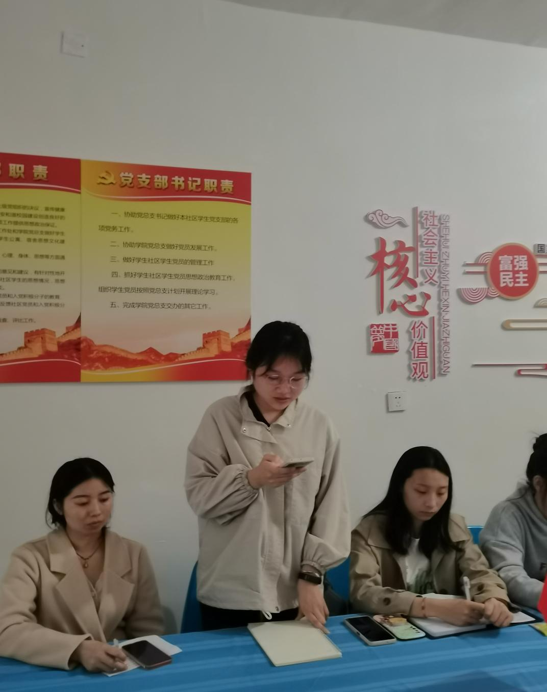 候星伊同学作为14栋学生党员代表进行发言,希望大家勇于担当,甘于奉献,争当履职尽责排头兵。能够齐心协力,团结拼搏,做务实高效的行动者。希望利用机会贡献一份力量,以后更加的努力带领大家一起共同进步。