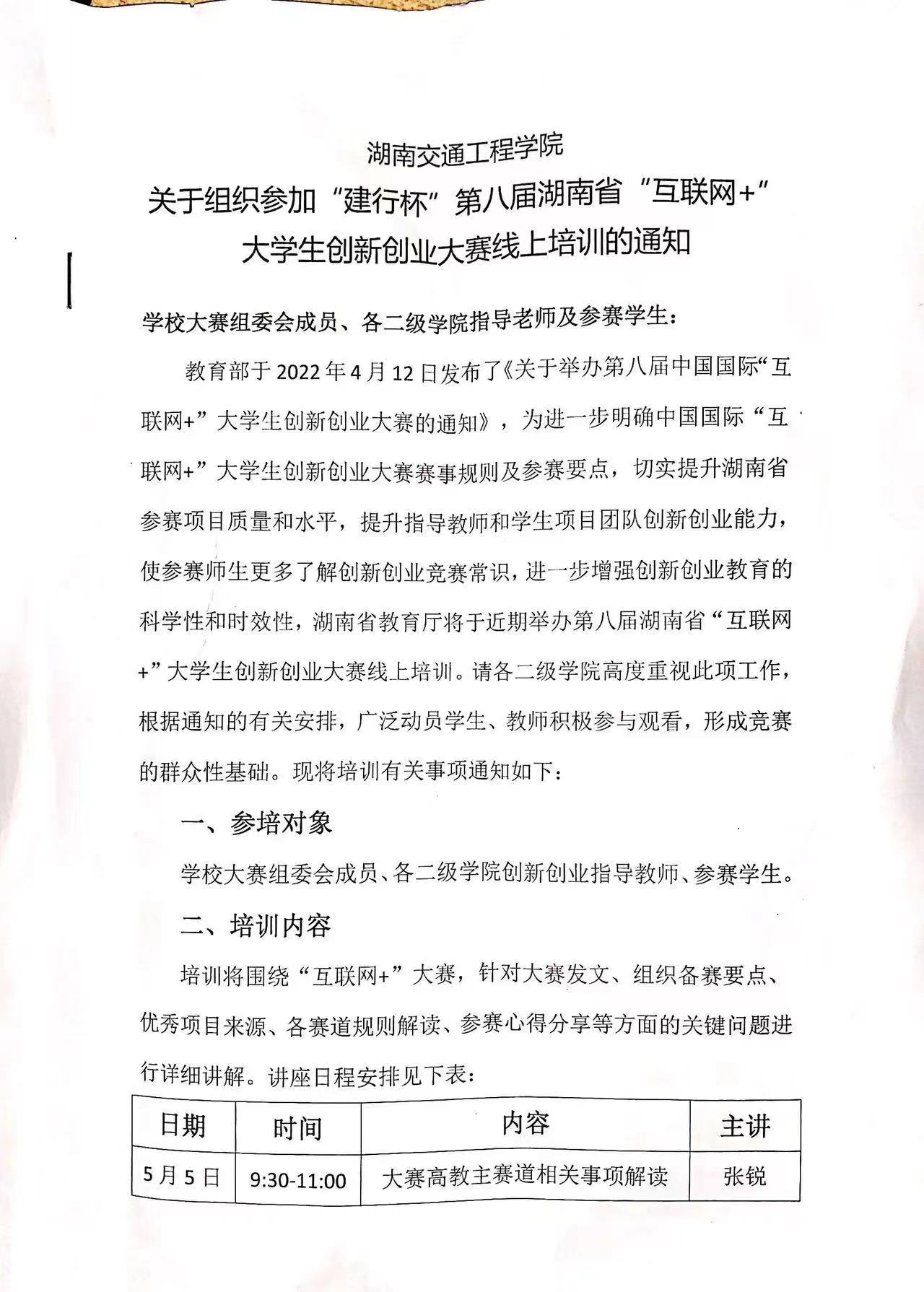 beat365手机版官方网站关于组织参加“建行杯”第八届湖南省“互联网+”大学生创新创业大赛线上培训的通知