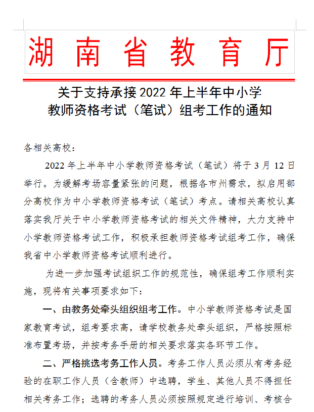 (转发)关于支持承接2022年上半年中小学 教师资格考试(笔试)组考工作的通知
