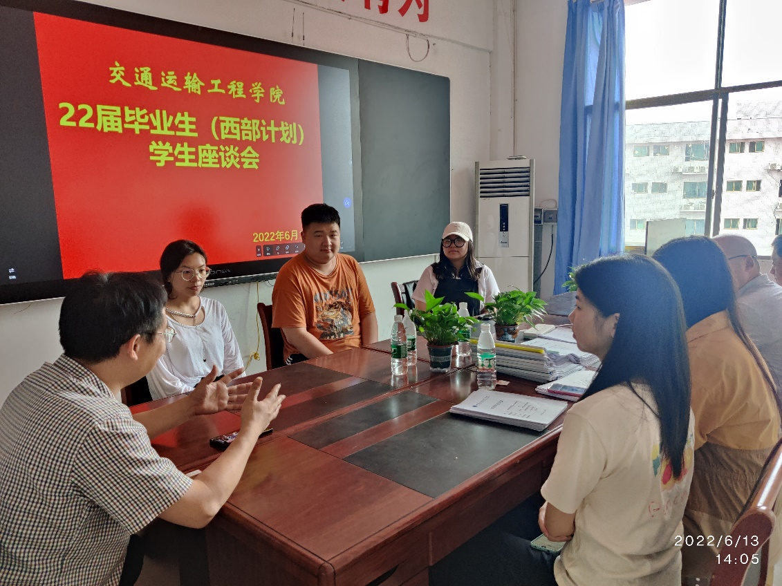 本网讯(通讯员 黄顺)6月13日下午,交通运输工程学院2022年“西部计划”志愿者座谈会在机电楼511办公室召开。出席本次座谈会的有交通运输工程学院党总支书记何美生、党总支副书记何文华和五名自愿加入“西部计划”的志愿者。