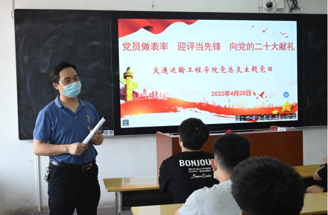 2022年4月28日,交通运输工程学院党总支在全体党员中开展“党员做表率,迎评当先锋,向党的二十大献礼”主题党日活动,团结带领广大党员干部贯彻落实各项工作任务,锚定“提效能、强队伍、促发展”的任务目标,增强先锋意识、使命意识、担当意识,以高质量发展优异成绩向党的二十大献礼。本次活动由交通运输工程学院党总支书记何美生主持。参加的还有院长罗迎社、副院长涂宇、党总支副书记书记何文华、全体辅导员及全体在校党员。