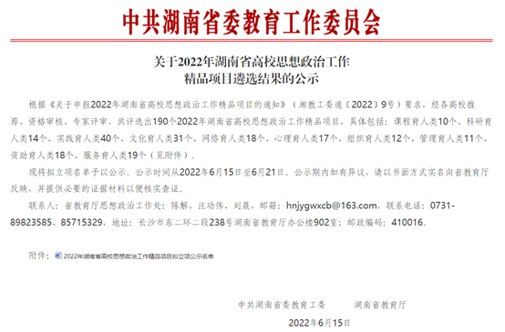 据悉,2022年共评出190个湖南省高校思想政治工作精品项目。具体包括:课程育人类10个、科研育人类14个、实践育人类40个、文化育人类31个、网络育人类18个、心理育人类17个、组织育人类12个、管理育人类11个、资助育人类18个、服务育人类19个。项目培育建设周期一般为2年。