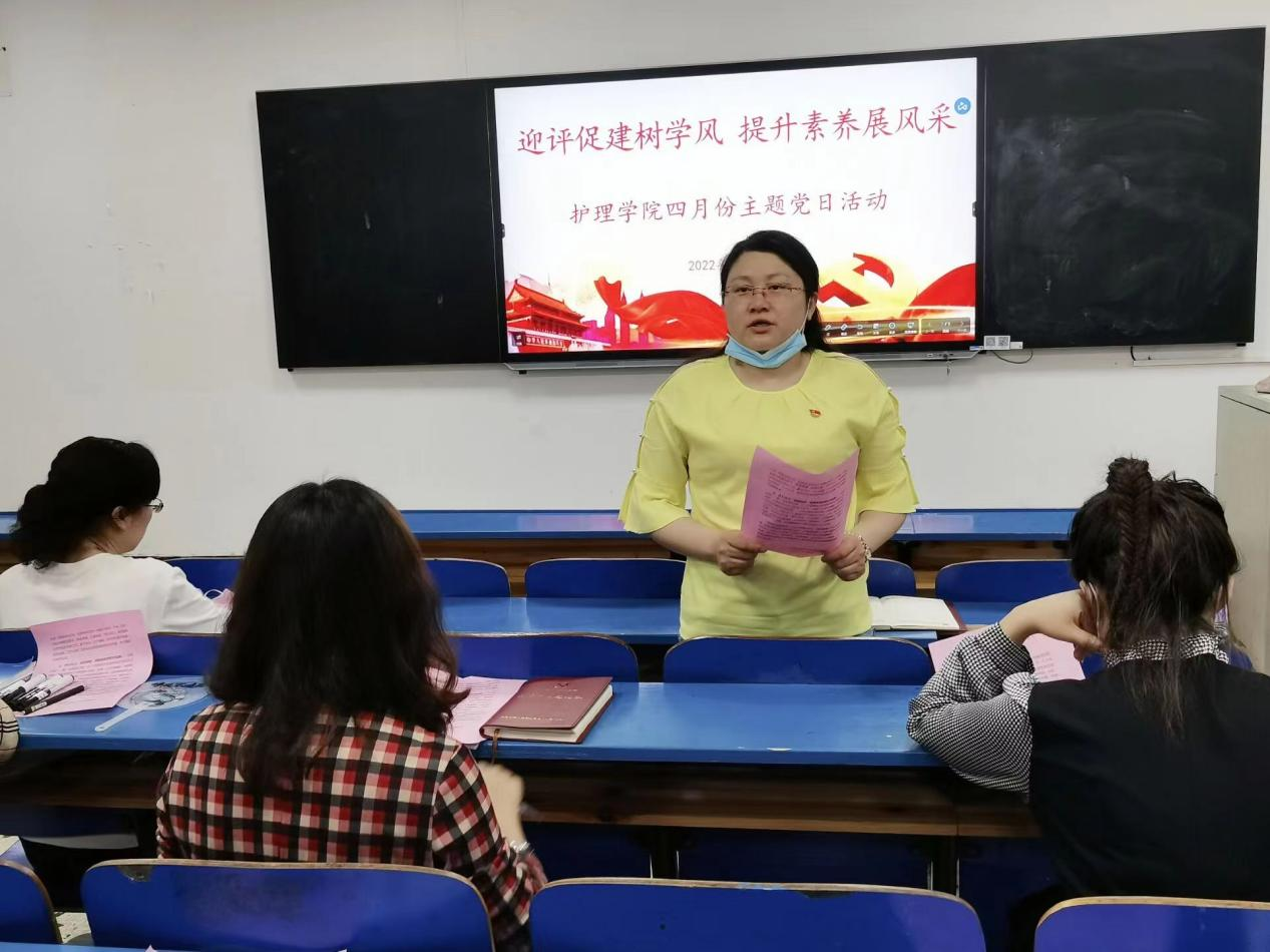 4月25日,护理学院党总支在教学楼101教室,开展四月“迎评促建树学风,提升素养展风采”主题党日活动。参加此次活动的有护理学院党总支书记邓丽、副书记肖桂香、教工党支部书记周艳平、全体教师、学生党员。会议由副书记肖桂香主持。