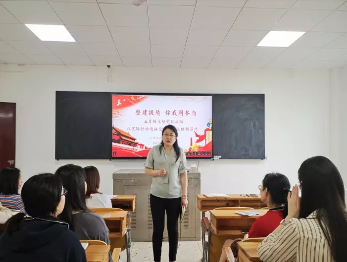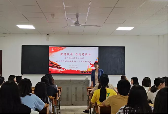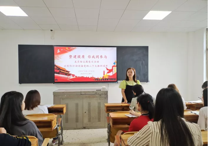 为以实际行动迎接党的二十大的顺利召开,护理学院党总支于5月28日上午在教学楼104教室召开了以“整建提质,你我同参与”为主题的五月份主题党日活动。参加此次会议的有护理学院党总支书记邓丽、团总支书记兼党总支副书记肖桂香、教工党支部书记周艳平、学生党支部书记贺九芳、14栋临时党支部书记刘梯、全体教师、学生党员。