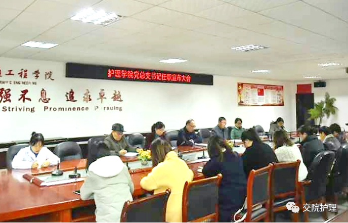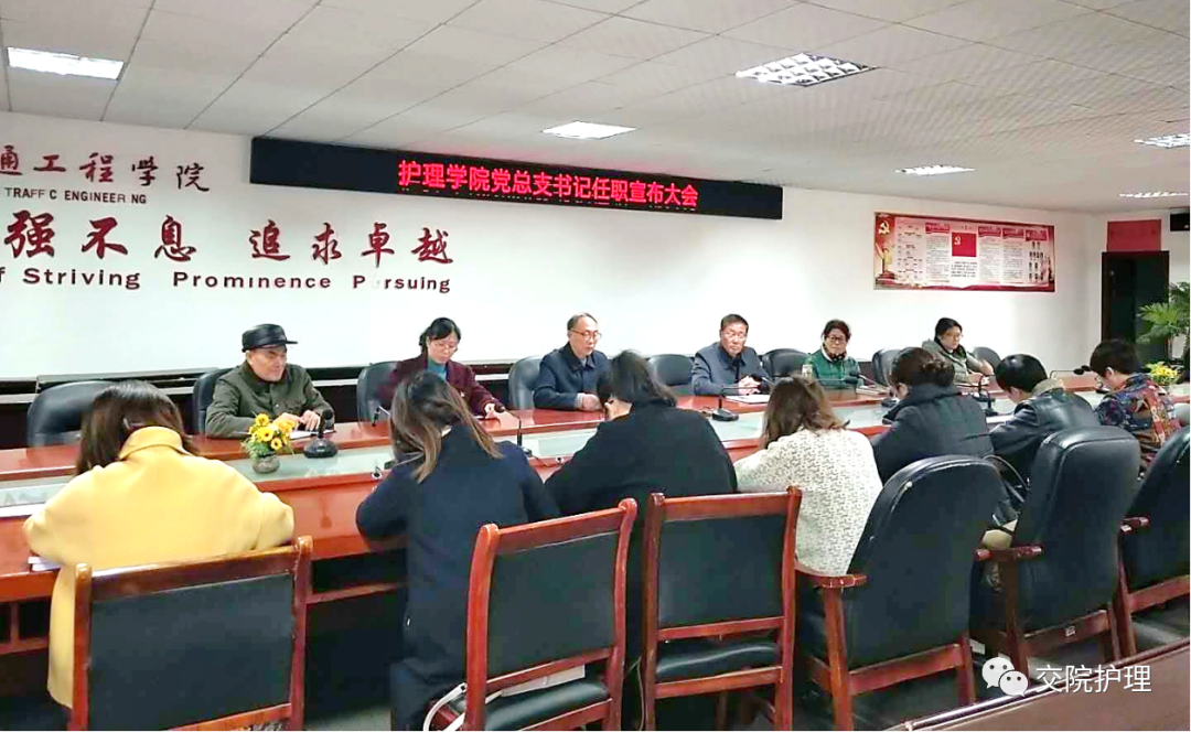 会议开始,首先由李先聪书记宣读校党委任命通知,宣布任命邓丽同志为新一届护理学院党总支书记,并对邓丽同志的基本情况进行了介绍。  接着,护理学院前党总支书记毛淑群就任职期间护理学院工作的基本概况以及我院前期所取得的成果进行了总结,并对大家工作上的配合表示感谢 然后,邓丽书记就校党委的任命决议进行了表态发言,表示会切实履行好职责,全力以赴做好各项工作,及时转换好角色,将和全院师生一起同心同向同行,将护理学院的各项工作更上一个新台阶。 最后,王兵院长代表护理学院对即将离任的毛淑群书记的工作给予了高度的肯定和评价,同时代表护理学院向校党委承诺将和新上任的党总支书记邓丽同志密切配合,大事多商量,小事多沟通,党政团结协作,共同推进护理学院各项事业发展。