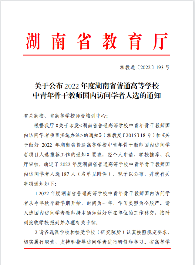 喜讯|转发:关于公布2022年度湖南省普通高等学校中青年骨干教师国内访问学者人选的通知
