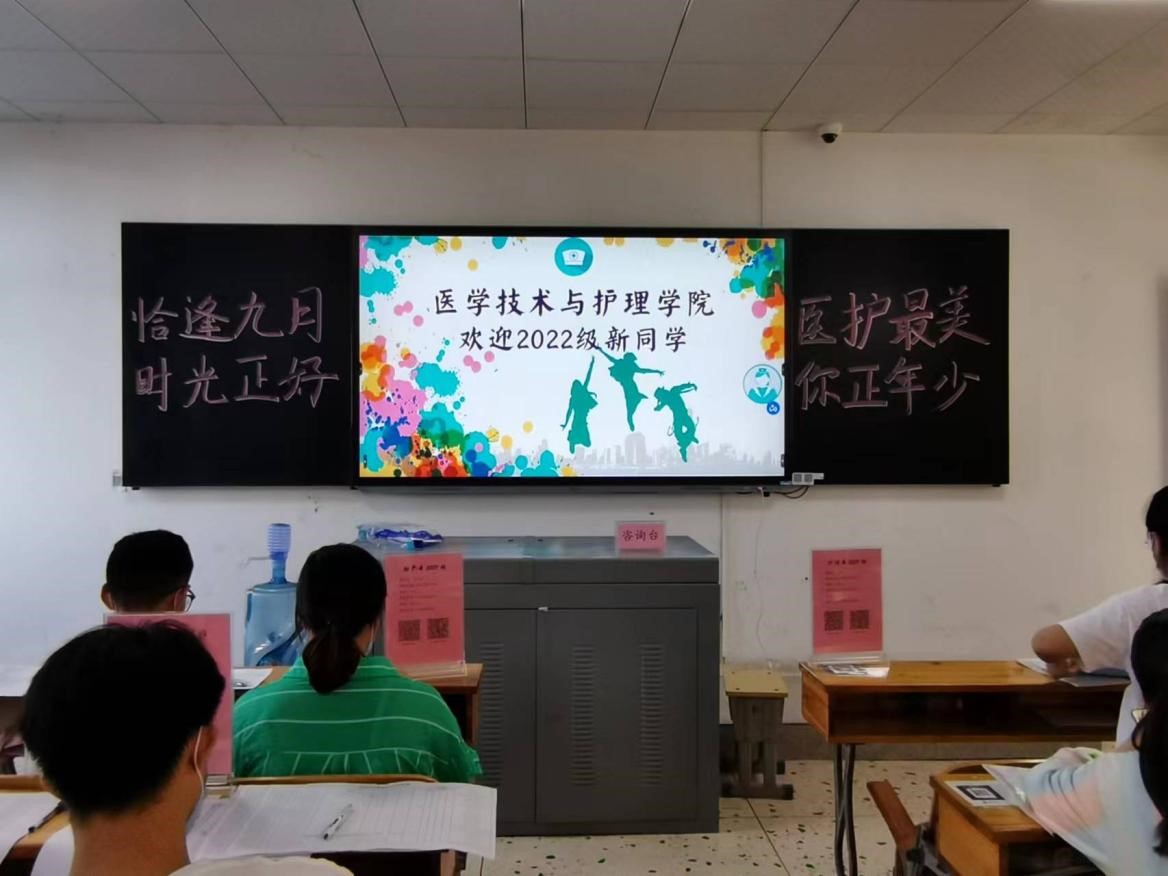 为了迎接2022级新同学,医学技术与护理学院的领导、老师和志愿者们在8月28号早上730之前全部抵达113教室准备迎新工作。