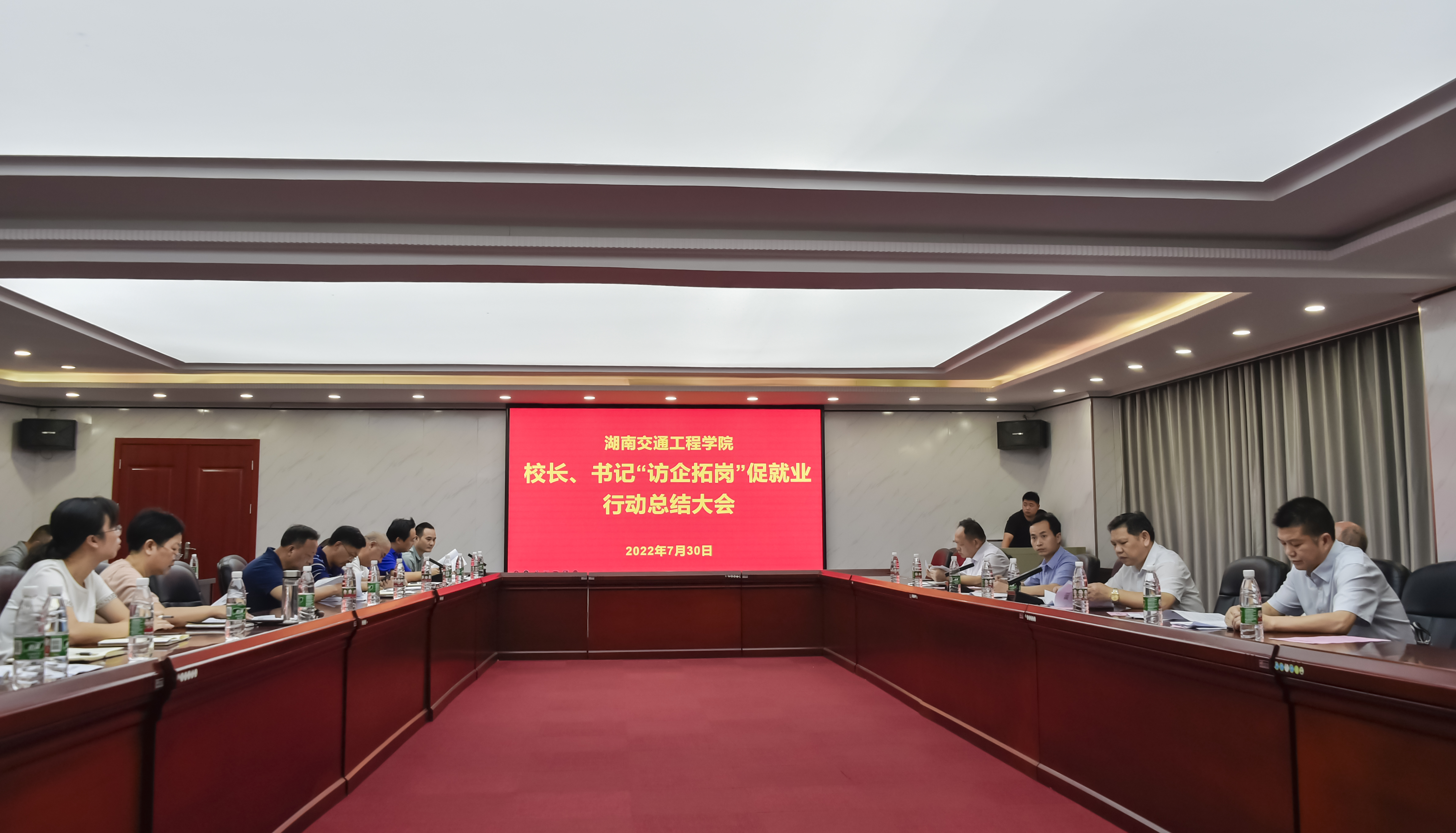 本网讯通讯员 赵红深  摄影 李建华 )7月30日上午,学校在体育馆103会议室组织召开校长、书记“访企拓岗”促就业行动总结会议,分析问题、总结经验、布置安排毕业生跟踪反馈工作,全方位推进就业工作开展。校长陈治亚、党委书记刘文君、常务副校长彭文武、副校长余孟辉出席会议;彭文武主持。