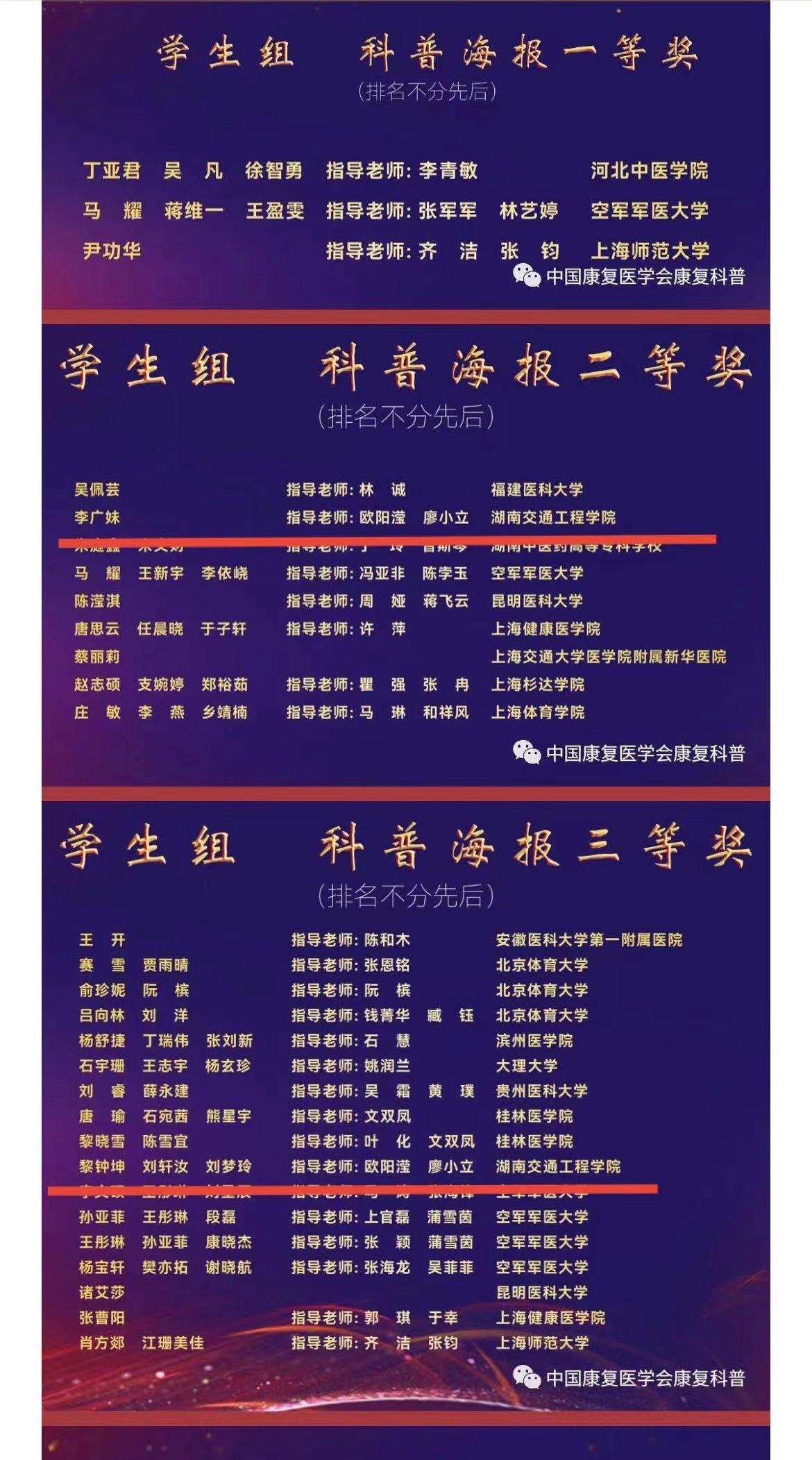 本网讯    金秋送爽,硕果飘香。9月16日由中国康复医学会主办的“中国康复医学会全国科普日联合行动暨康复科普年会与科技创新高峰论坛”在南宁隆重召开。大会评选了“全国第四届康复科普创新作品(图文类)优秀作品”。beat365医学技术与护理学院欧阳滢、廖小立老师指导的李广妹同学获科学海报二等奖,欧阳滢、廖小立老师指导的黎钟坤、刘轩汝和刘梦玲同学组成的团队获科学海报三等奖。这个奖项的取得非常不容易,二等奖全国才8项。